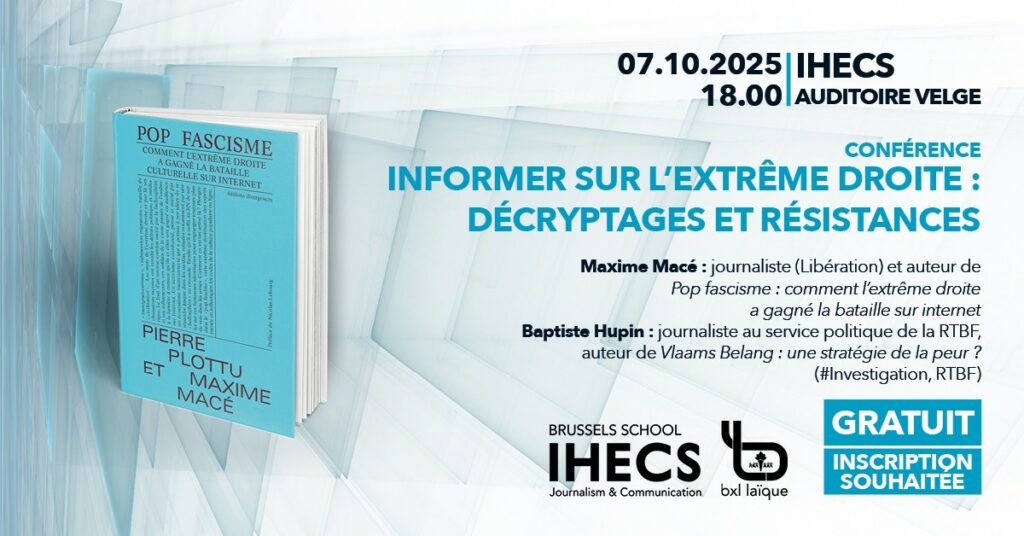Comment l’extrême droite a-t-elle gagné la bataille culturelle sur Internet ? Une plongée dans les mécanismes de la fachosphère et les défis que cela pose aux journalistes d’aujourd’hui et de demain. Conférence avec Maxime Macé, autour de l’ouvrage « Pop fascisme » (co-écrit avec Pierre Plottu) et Baptiste Hupin, journaliste politique à la RTBF. « Grand remplacement […]